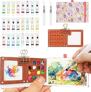 Mini Watercolour Paint Set Travel with Durable 15 Grids Walnut Palette – Includes 24 Colors, 2 Water Brushes, Metal Clip & Sketchbook for Artists, Students for Outdoor Art and Journey Painting