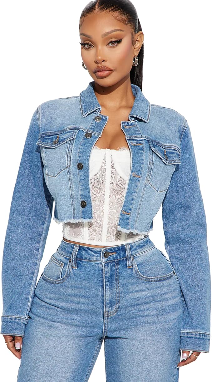 Blue Washed Cropped Denim Jacket for Women Button Down Long Sleeve