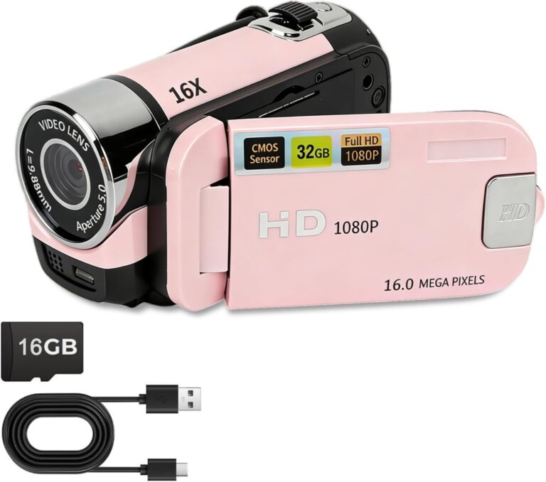 Camcorder Video Camera, 1080P 16MP DV Digital Camera, 2.4 Inch Recorder 270° Degrees, 16X Kids Vlogging Video Camer with Fill Light & 16GB SD Card for Travel Recording(Pink)